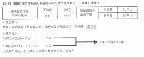 本通達改正では、物納許可限度額の計算上の延納機関に係る年数について、(1)従来の取扱いに加え、不動産と動産等が混在する場合は各区分の最長年数に、その財産の価額の合計額が相続財産の価額に占める割合を乗じた年数(1年未満は切捨て)を合計した年数(【参考】)、又は(2)厚生労働省が公表する完全生命表に揚げる平均余命年数(1年未満は切捨て)のいずれかの短い年数とされました。