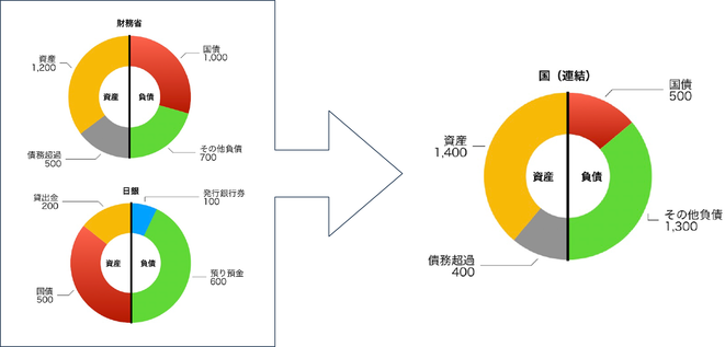 左側に資産の内訳を、右側に負債の内訳を表した円グラフを見ると、国単独(財務省)が債務超過に陥っている。これを、日銀と合わせた国全体(連結)にすると、国単独の国債(負債)と日銀の国債(資産)が相殺されて、国(連結)の国債(負債)は500兆円に圧縮される。それでも債務超過であることに変わりはない。