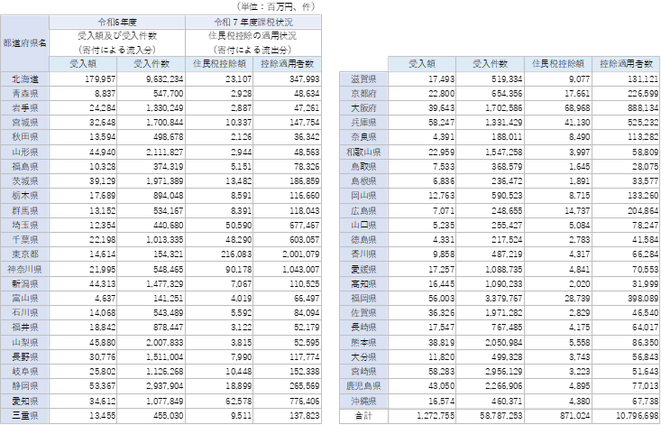 ※住民税控除額等の実績は、全市区町村を対象に、前年中(令和6年1月1日~令和6年12月31日の間)のふるさと納税に係る令和7年度課税における控除の適用状況(令和7年6月1日時点)を調査したもの